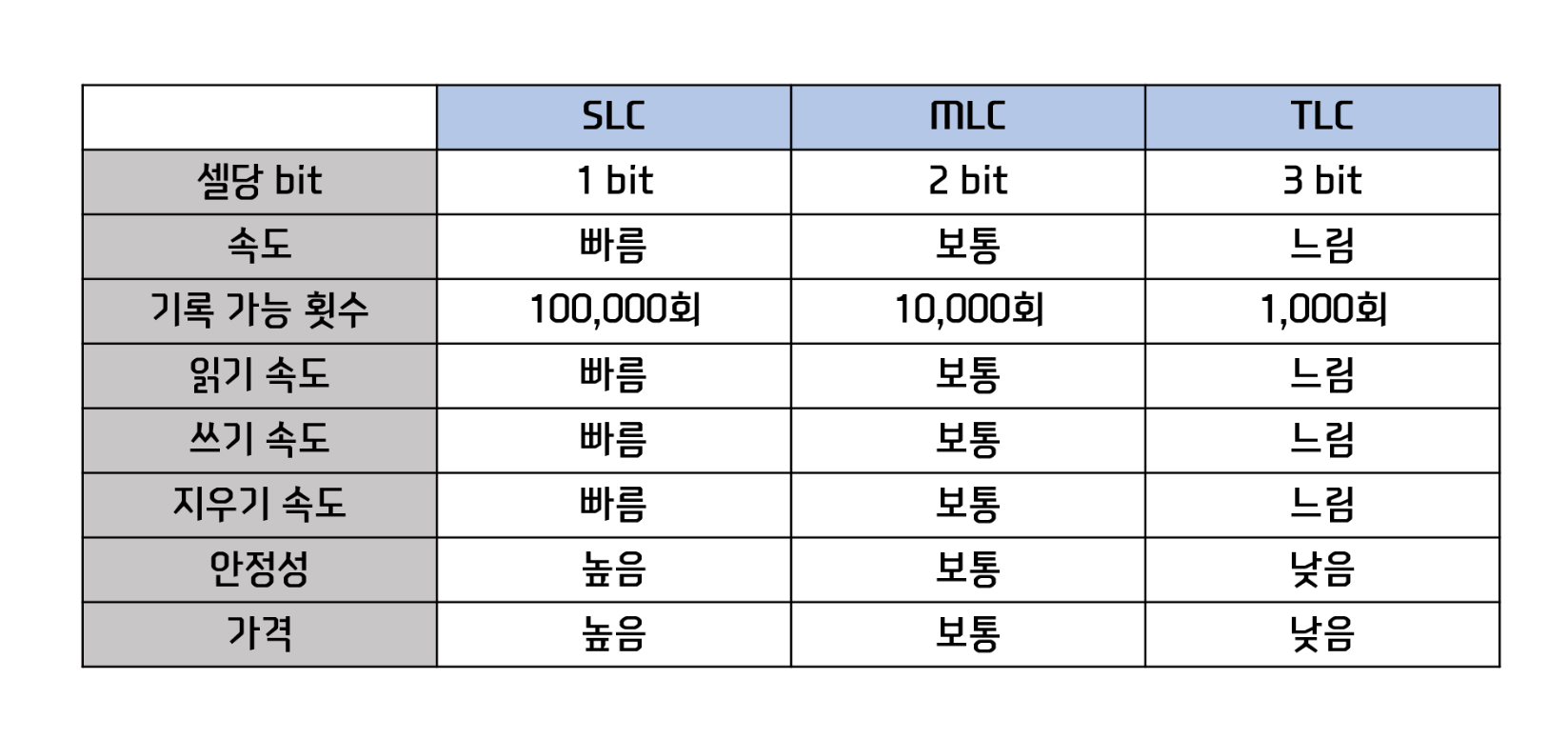 → 00, 01, 10, 11 총 4 가지 저장 가능. - TLC(triple-level cell): 한 셀에 3비트씩 저장할 수 있는 셀.