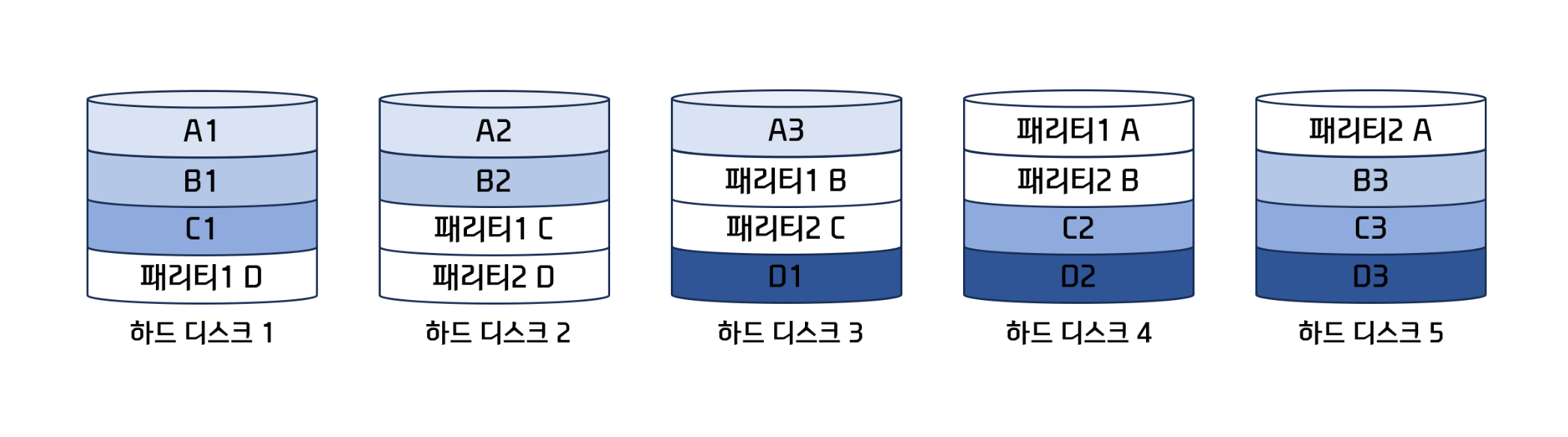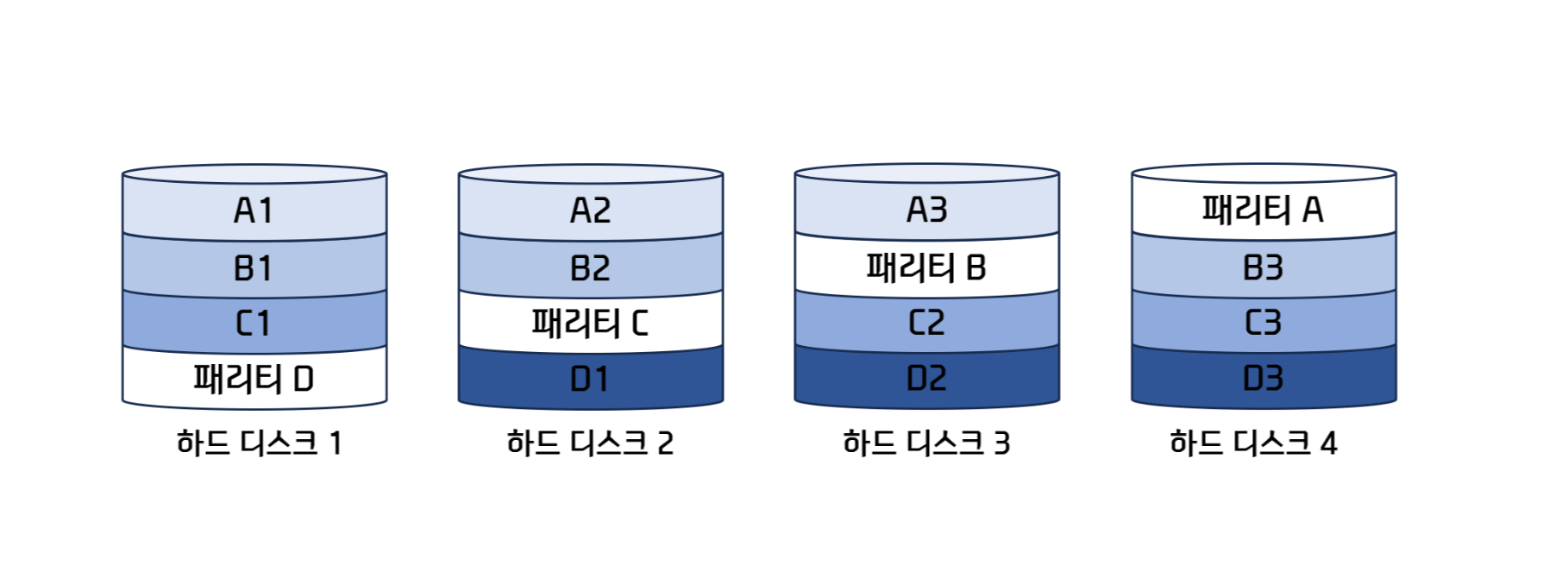 → 적은 하드 디스크로 데이터를 안전하게 보관할 수 있는 방식. 패리티 디스크를 통해서 오류 검출과 복구가 가능하다.