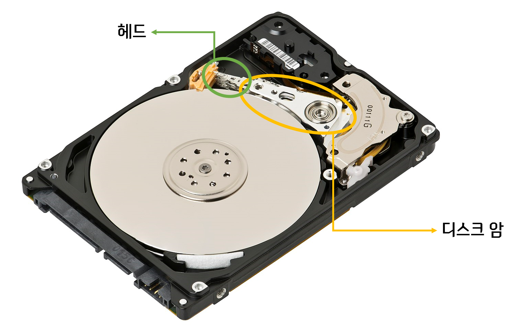 - 헤드(Head): 플래터를 대상으로 데이터를 읽고 쓰는 구성 요소. 디스크 암에 부착.