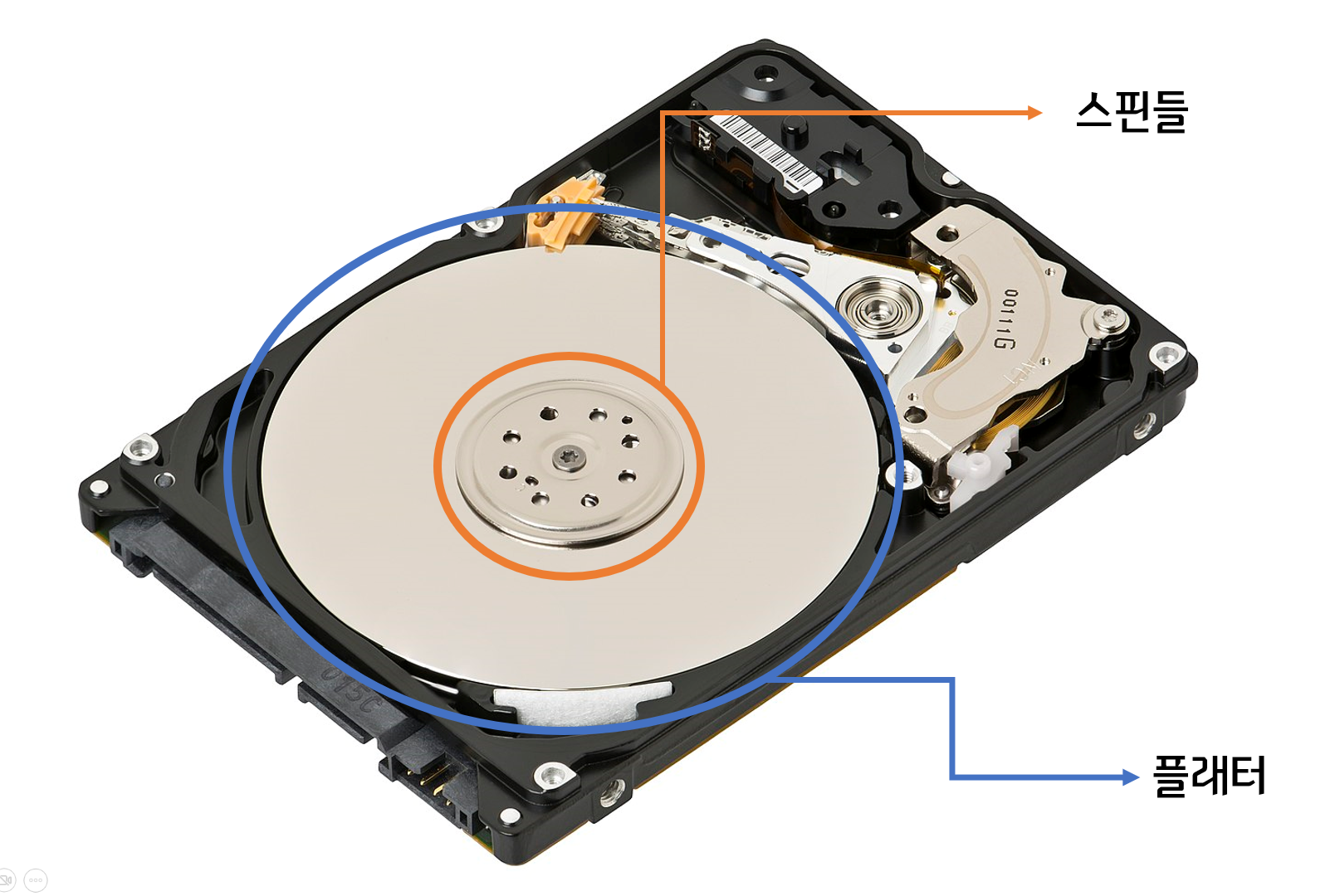 - 플래터(platter): 동그란 원판. 하드디스크에서 실질적으로 데이터가 저장되는 공간.