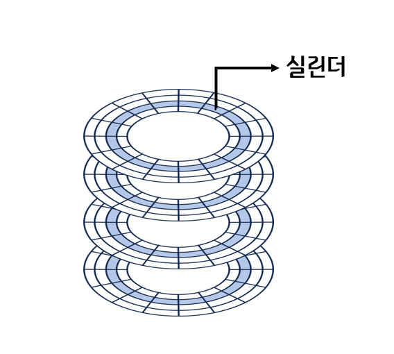 - 실린더(cylinder): 여러 겹의 플래터 상에서 같은 트랙이 위치한 곳을 모아 연결한 논리적 단위.
