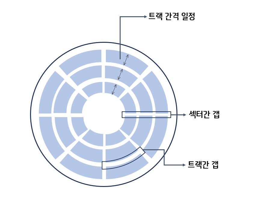 - 트랙간 갭: 트랙 사이의 간격. 트랙간의 자기장 간섭을 방지하기 위한 간격.