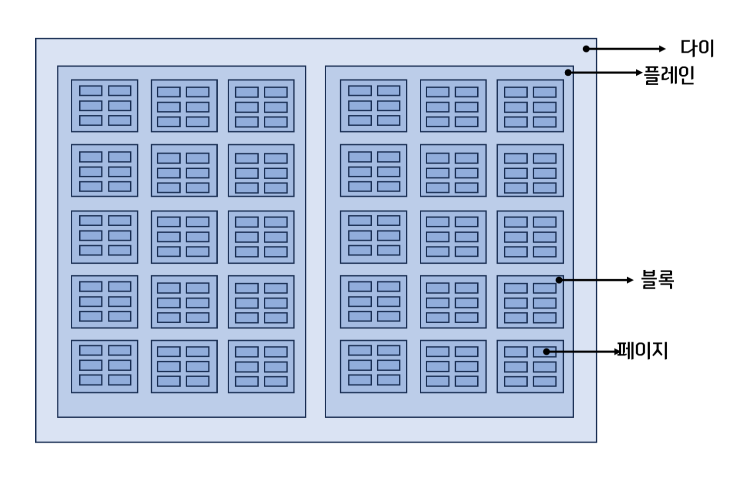 - 다이(die): 플레인이 모여 만들어진 단위.