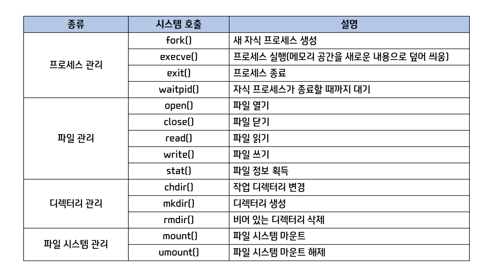 - 시스템 호출(system call): 사용자 모드로 실행되는 프로그램이 운영체제 서비스를 제공받기 위해 커널 모드로 전환하는 요청. 소프트웨어 인터럽트에 포함된다.