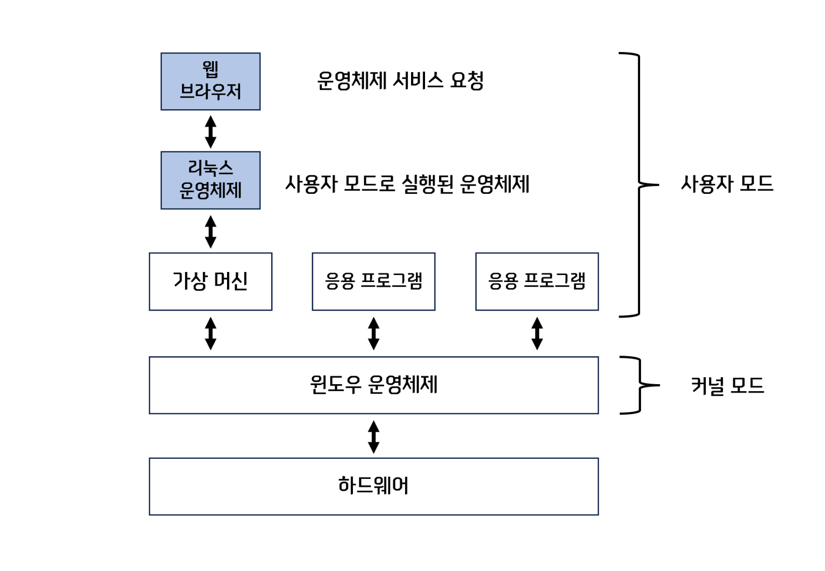 - 커널 모드(kernel mode): 운영체제 서비스를 제공받을 수 있는 실행 모드. 커널 영역의 코드 실행 가능.