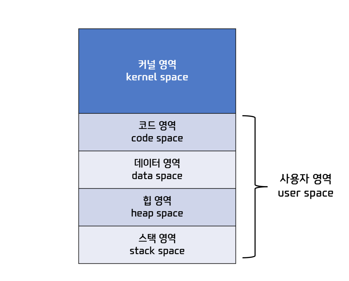 - 사용자 영역(user space): 메모리 공간에서 사용자가 이용하는 응용 프로그램이 적재되는 영역. 스택 영역, 힙 영역, 데이터 영역, 코드 영역이 사용자 영역에 포함된다.