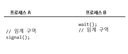 => S값을 확인하는 wait() 함수를 만나 임계 구역 진입 불가능(S 초기값은 0이기 때문에). A가 임계 구역에 먼저 진입하게 된 후 signal() 호출된 후 B가 임계 구역 진입 가능.