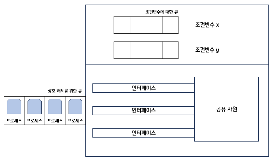 - 조건 변수에 대한 큐는 이미 모니터 내에 진입 상태.