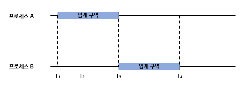 - T2: 프로세스 B가 임계 구역에 진입하려 시도.