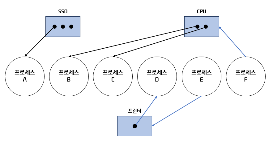 - 프로세스가 어떤 자원을 기다리고 있다면 프로세스에서 자원으로 화살표 표시