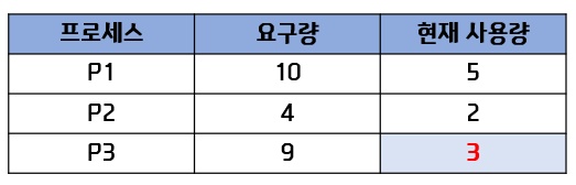* 각 프로세스들이 최대로 자원을 요구하였을 시 P2의 작업을 올바르게 마치더라도 P1과 P3은 서로의 자원을 무한정 대기. 교착 상태 발생.