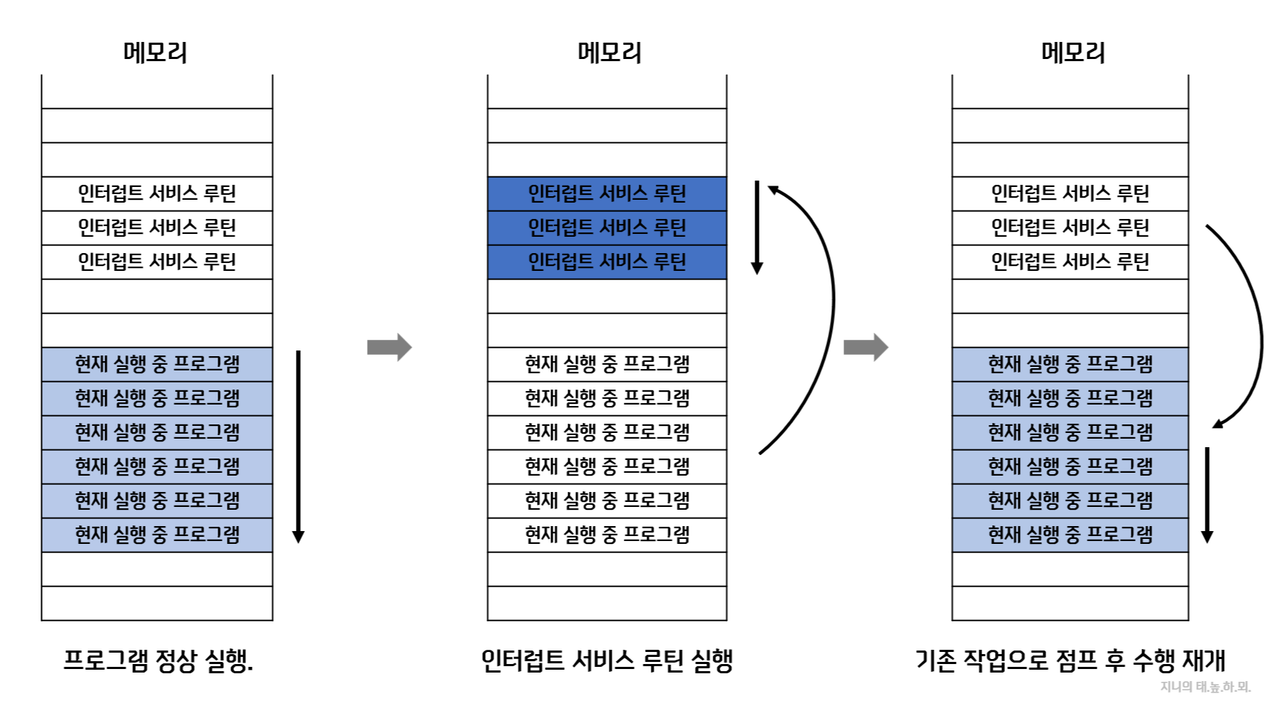 - CPU는 실행 사이클이 끝나고 인터럽트 여부 확인.
