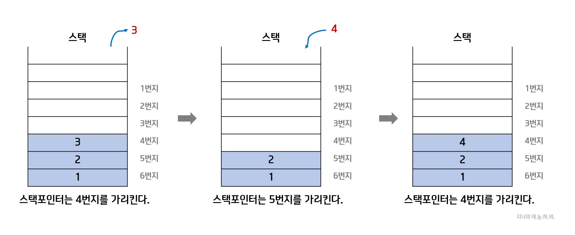 - 스택 포인터(stack pointer): 스택의 최상위 주소를 저장하고 있는 레지스터.