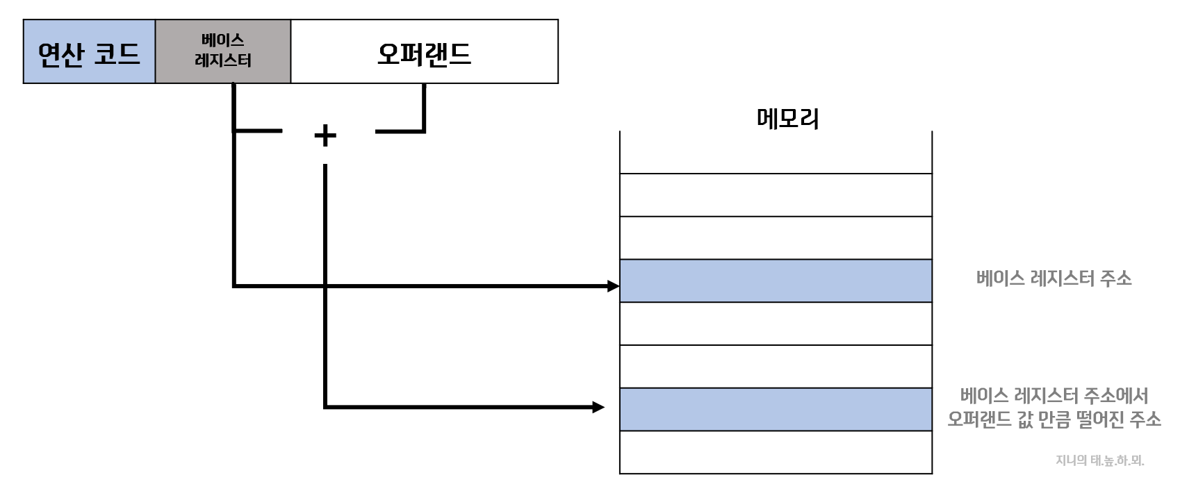 2. 베이스 레지스터 주소 지정 방식: 오퍼랜드와 베이스 레지스터의 값을 더하여 유효 주소를 얻는 방식.