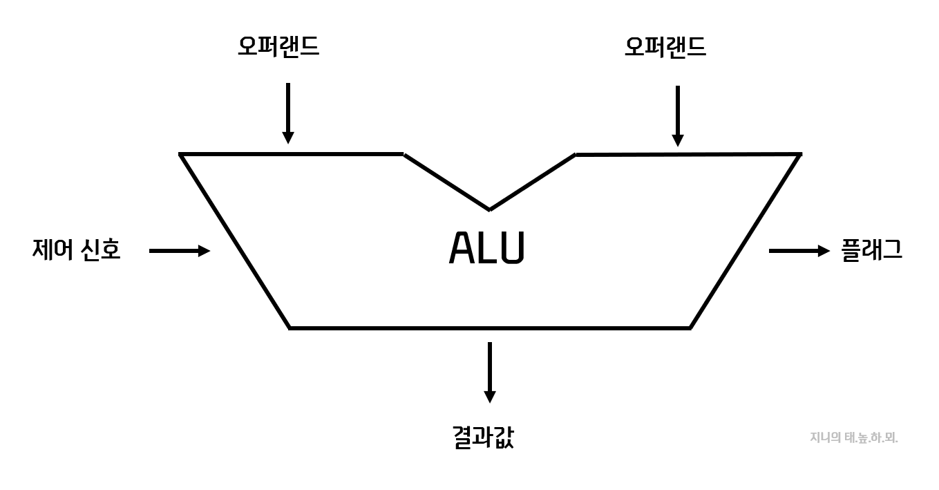 ALU는 레지스터를 통해 피연산자를 받고, 제어장치로부터 수행할 연산을 알려주는 제어 신호를 받음.