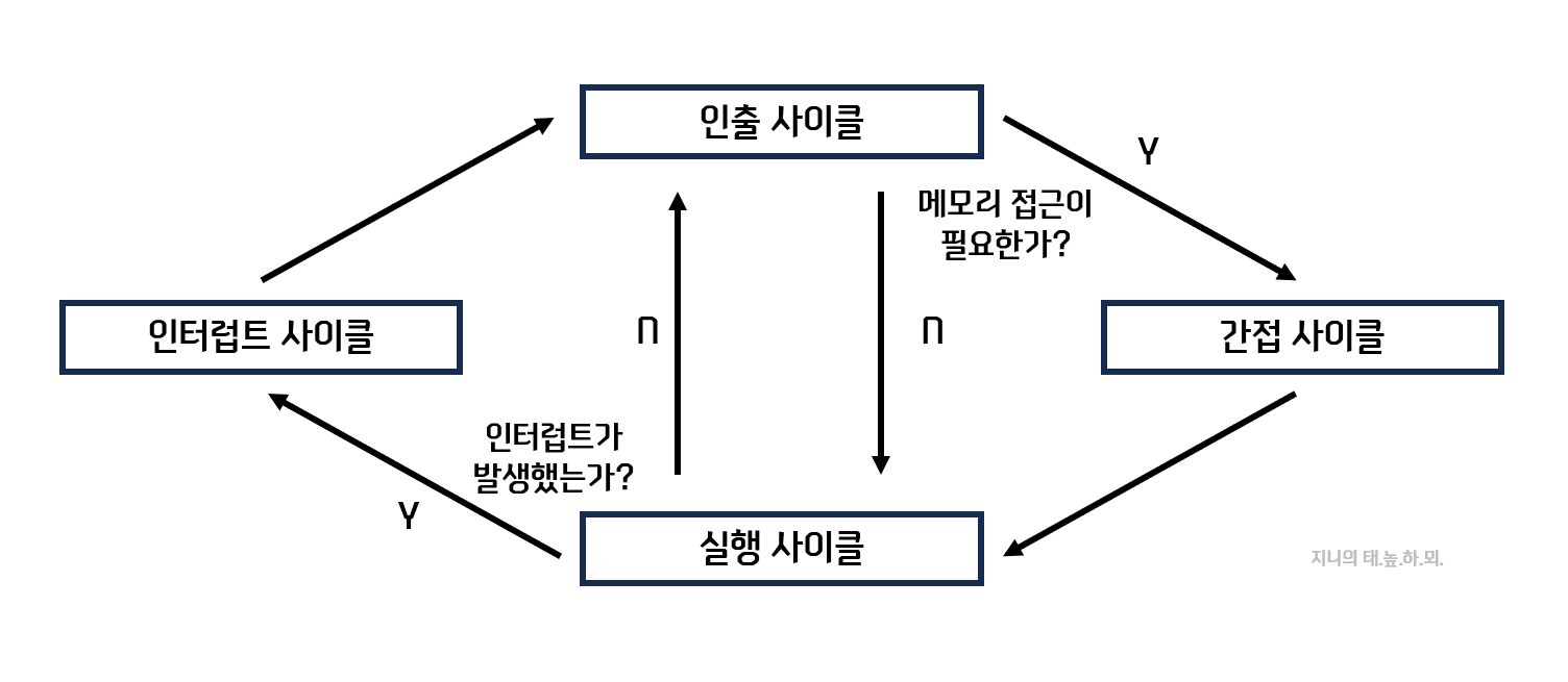 - 실행 사이클: CPU로 가져온 명령어를 실행하는 단계