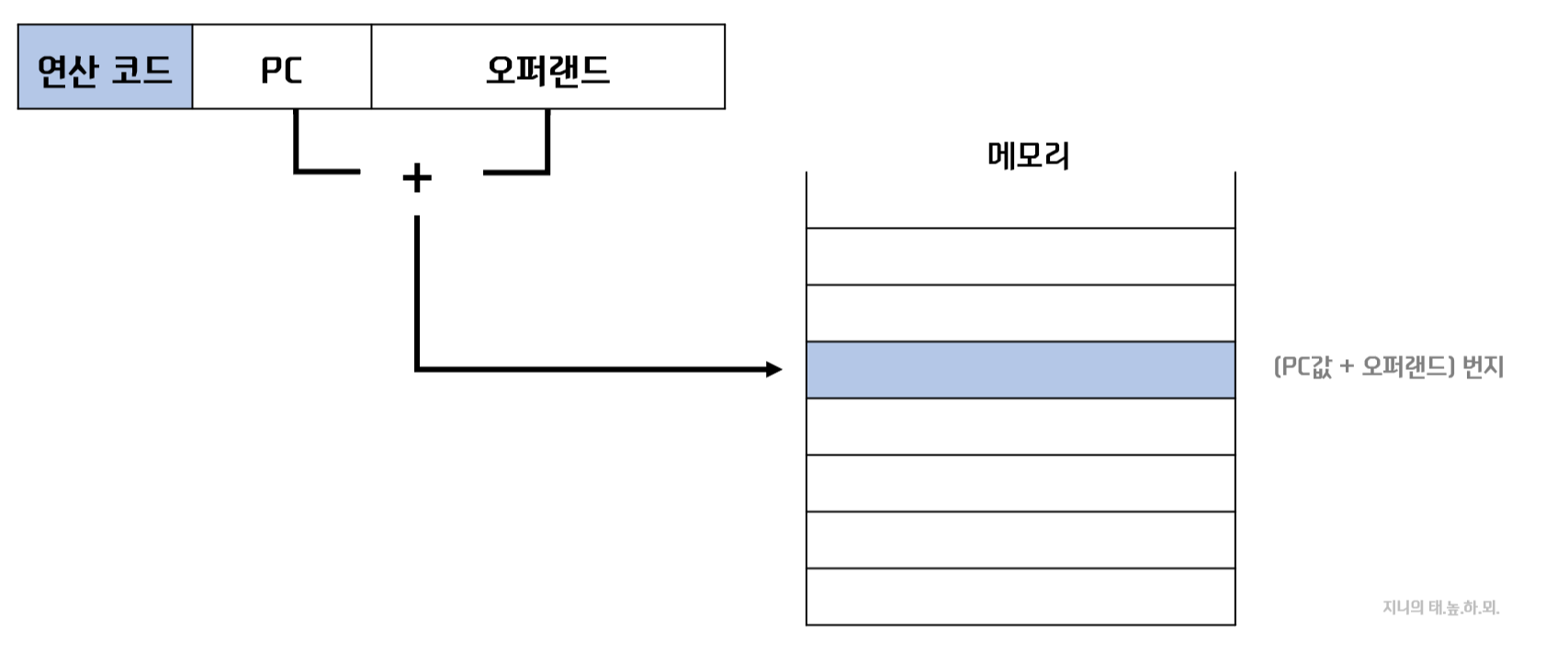 1. 상대 주소 지정 방식: 오퍼랜드와 프로그램 카운터의 값을 더하여 유효 주소를 얻는 방식.