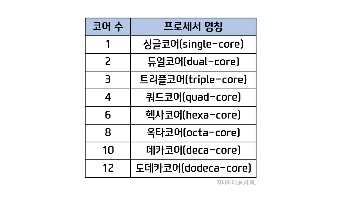 - 멀티코어(multi-core) CPU: 코어를 여러 개 포함하고 있는 CPU. 멀티코어 프로세서 라고도 함.