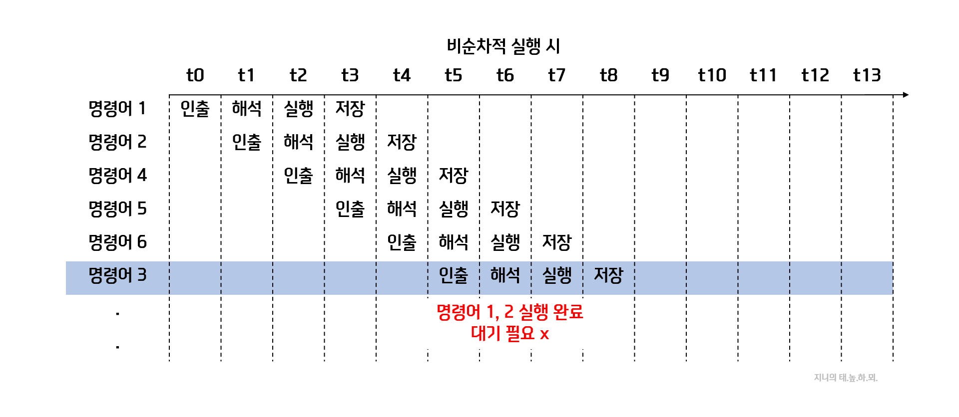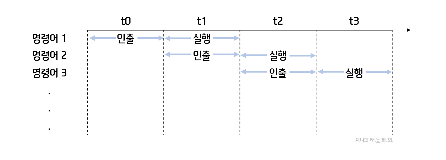 * 각 단계가 겹치지 않으면 CPU는 각 단계를 동시에 실행할 수 있다. 즉 CPU는 여러 개의 명령어를 동시에 처리할 수 있다.