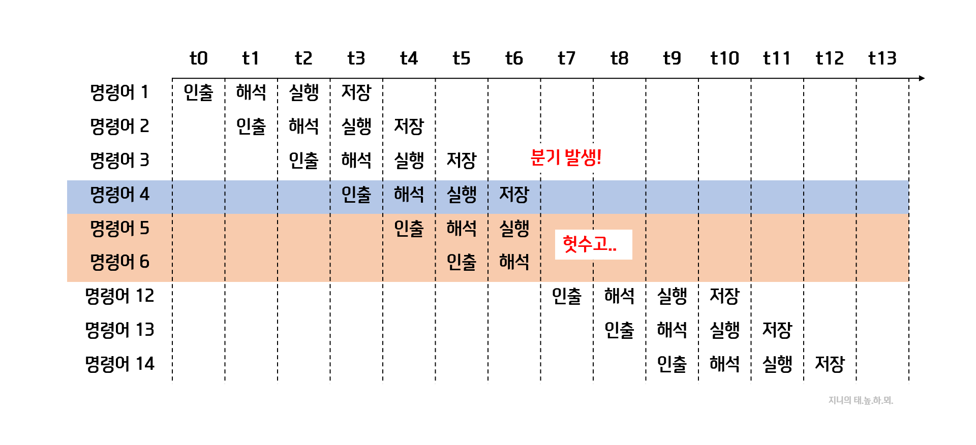 * 이를 해결하기 위해 분기 예측, 분기 목적지 선인출, 루프 버퍼 등 많은 기술이 개발되고 사용됨.